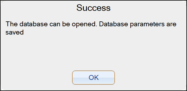 A message will appear saying “Success” The database parameters are saved when you click OK.