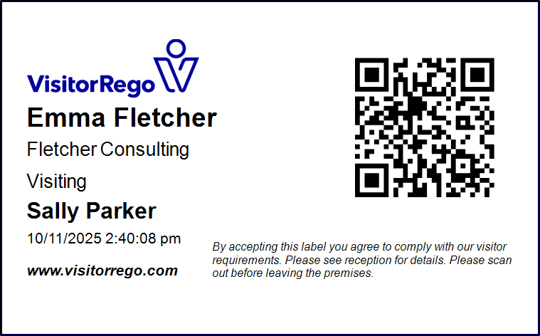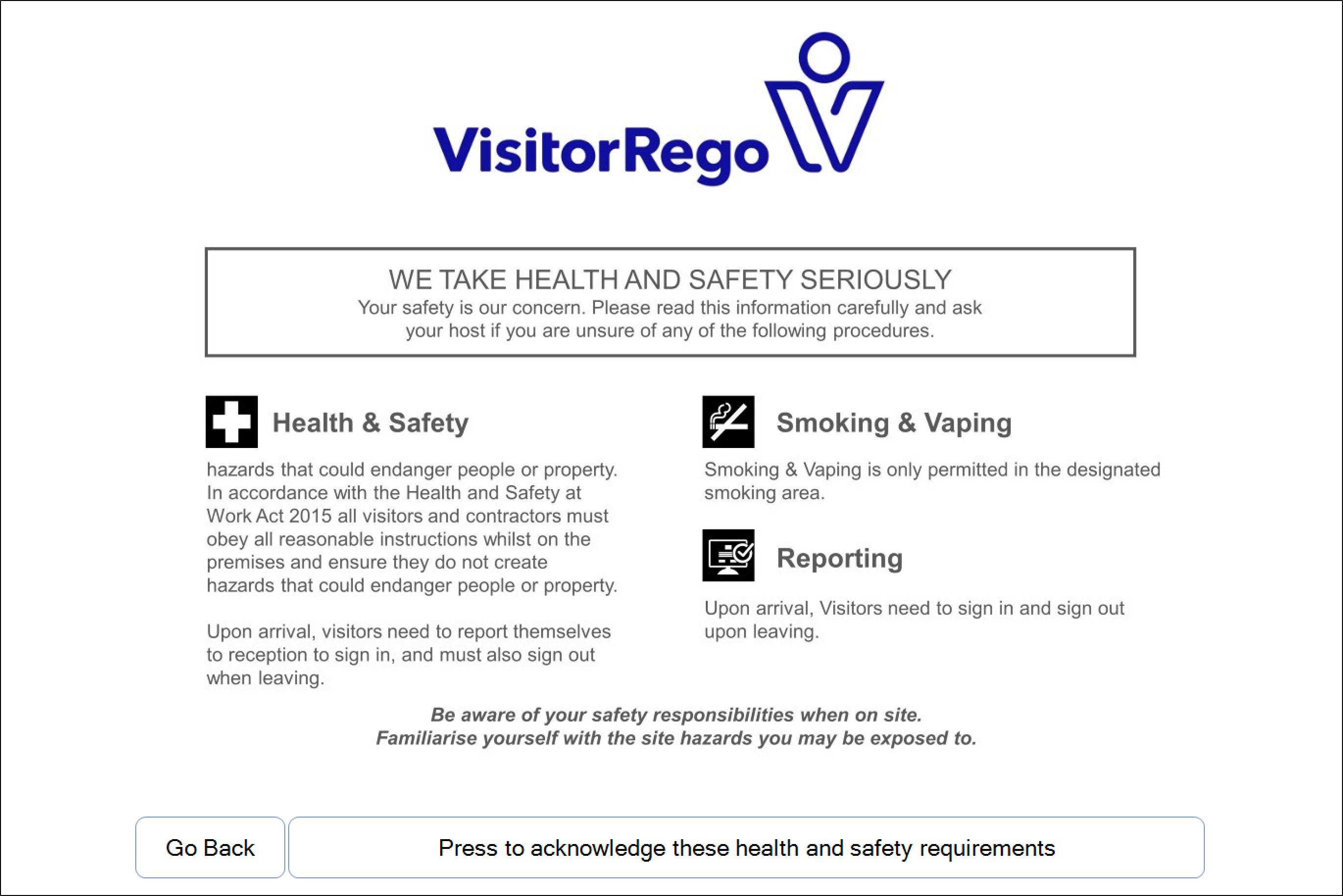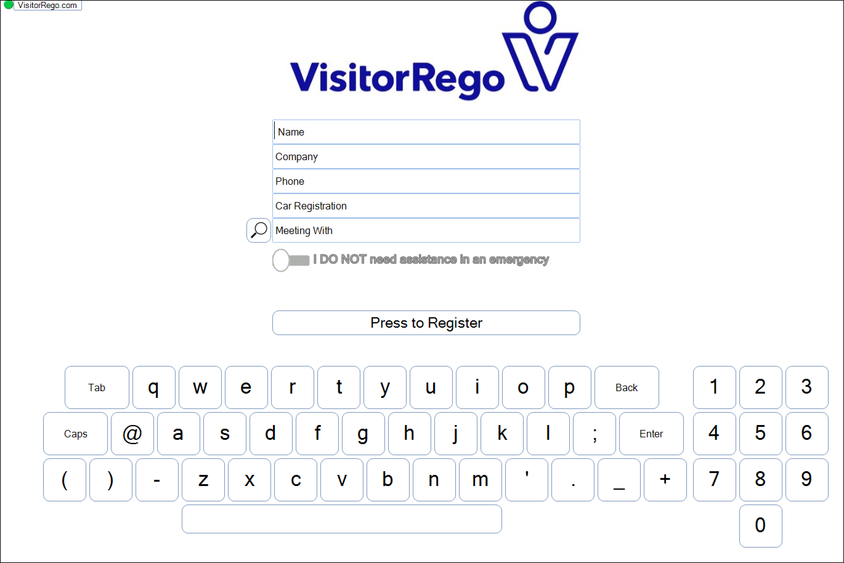 VisitorRego The name of the visitor registration software, used to register visitors, run reports regarding who is on-site and when, print identification labels and notify staff. Self Registration Mode Self Registration Mode is the setting where ...