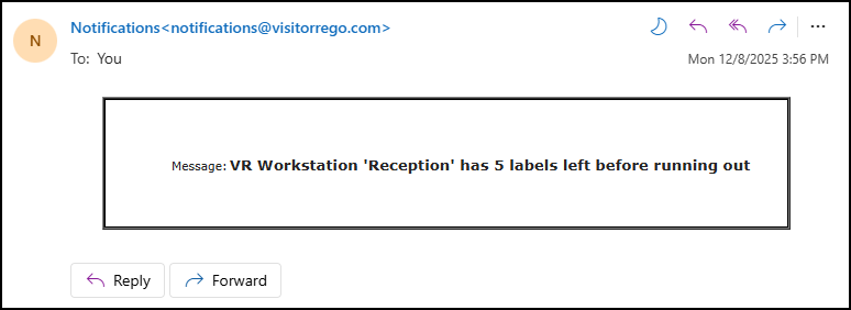 This feature is particularly useful when the VisitorRego device is in an unattended area or when the printer is installed in a location that is not immediately accessible, helping to prevent situations where labels run out unexpectedly.