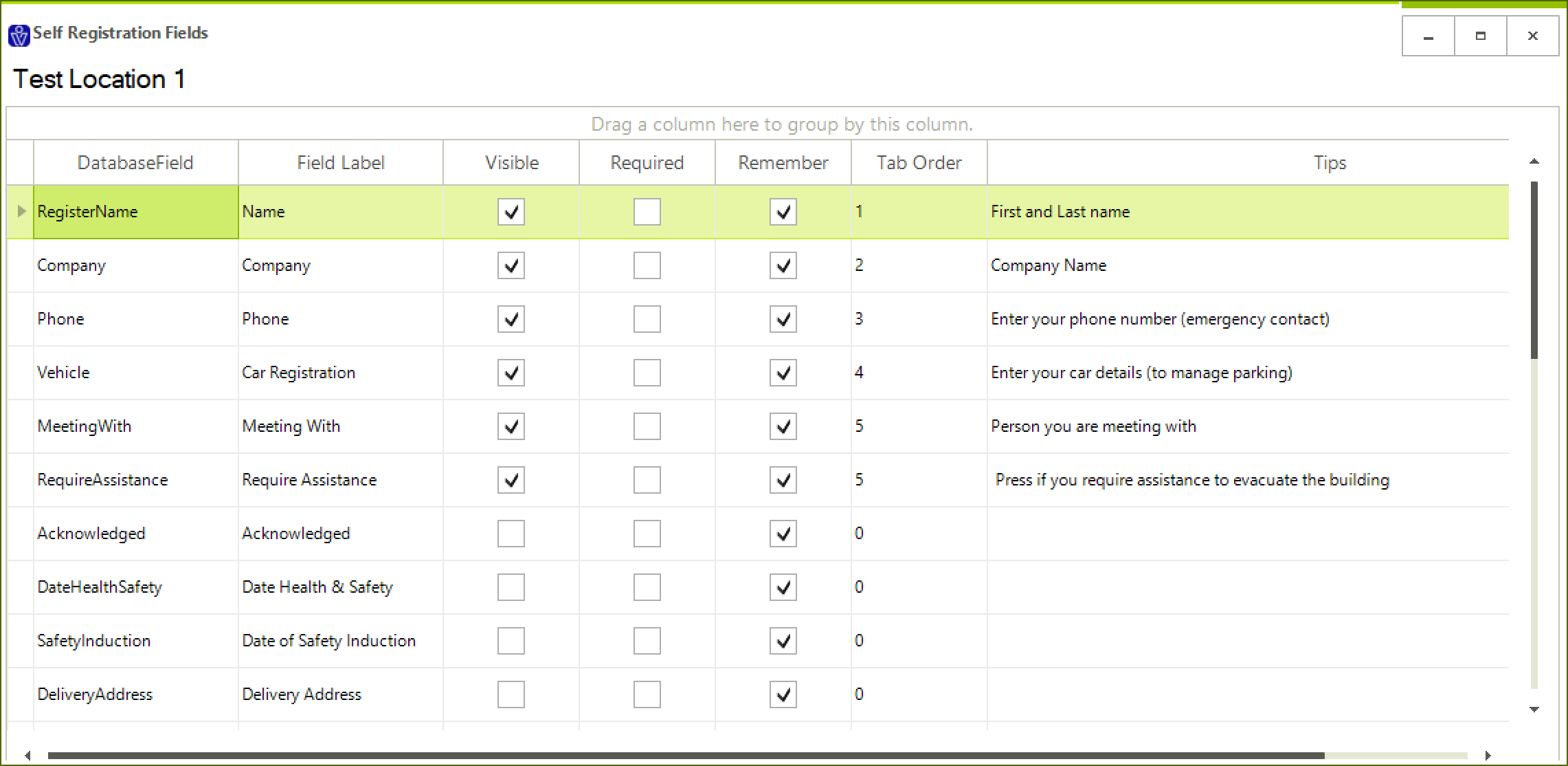 The column DatabaseField is the database field where the data is stored. This name can not be changed. i.e. You can label the DatabaseField 'Vehicle' to 'Car Registration'. This field will now appear on the screen as 'Car Registration' and the data entered into this field is stored in the database field 'Vehicle'.