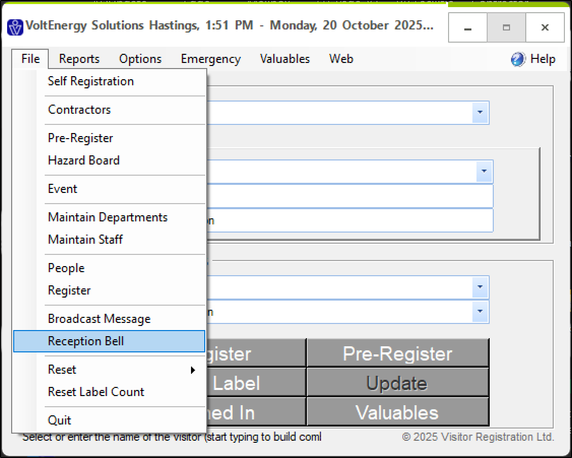 1. From VisitorRego's Admin mode, select File > Reception Bell.