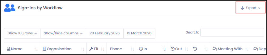 To export all information currently displayed on the page, click the Export drop-down field found at the top right of the page.